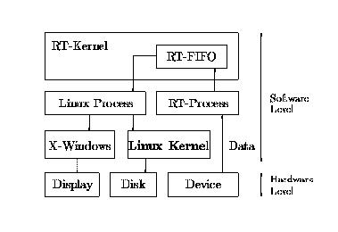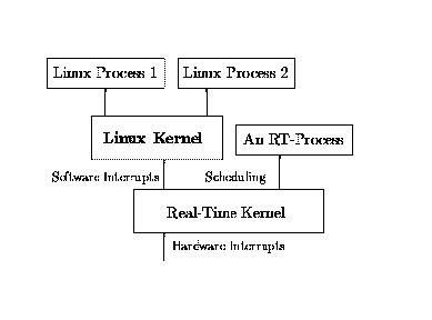The basic idea is to make Linux run under the control of a real-time kernel (See Figure 2). When there is real-time work to be done, the RT operating system runs one of its tasks. When there is no real-time work to be done, the real-time kernel schedules Linux to run. So Linux is the lowest priority task of the RT-kernel.