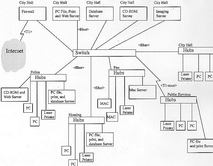 In June of 1996, the City added a T1 speed Frame Relay connection to Intelenet Internet Services, adding yet another Linux Server that acts as a firewall between the new Frame Relay line and the City's network. IS is currently in the process of bringing the City's WWW page in house. We can now write applications to make information on the Pick Server available to the world via the World Wide Web. IS is also creating an imaging system based on the WAIS server—so development continues.