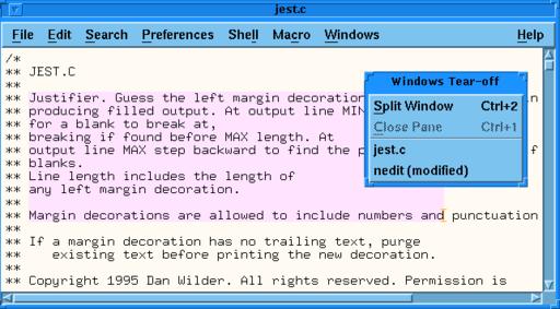 Weighing in at a little over a megabyte for the static-linked Motif binary, NEdit starts up slower than the last editor I wrote about, xvile, but much faster than emacs or xemacs. Scrolling is fast, and command execution shows no perceptible delay.