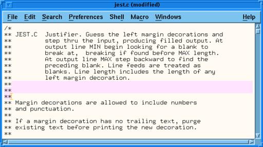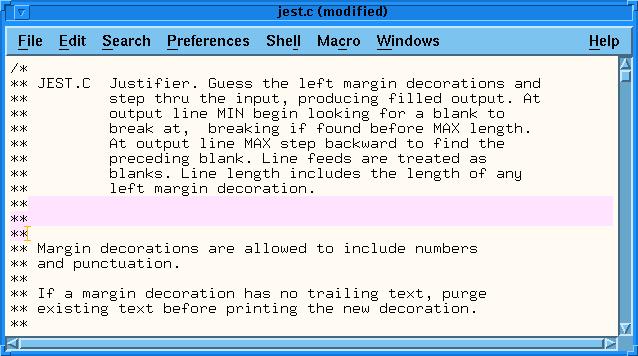 Ever struggle with some editor's notion of how a C comment block should look? Seems like nobody gets it quite right, and nobody handles all the oddball cases. Now, with NEdit, I can take a typical function header as in the illustration, and with just a few mouse clicks and keystrokes convert this into a much neater form.