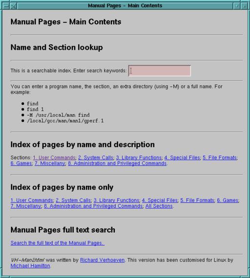 Figure 1 shows the main vh-man2html web page which provides direct access to individual man pages or to three different kinds of indices: name-description, name-only and full text search. In the main window you can enter the man page name, man page name and section number, or narrow things down even further by specifying the hierarchy or full path name.