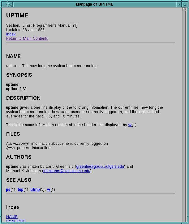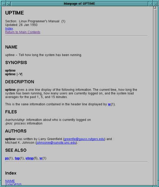 Figure 2 shows a man page generated by the man2html converter. The converter has translated the man formatting tags to approximately equivalent HTML tags. It has also created an HTTP reference and links for any references to other man pages. The converter also generates a subject heading index, which is useful when reading larger man pages. Text highlighting and font changes are correctly translated, and if tables are present, they will be translated into HTML tables. At this time, man2html doesn't translate eqn described equations, but since very few man pages use eqn, this is not a major drawback.