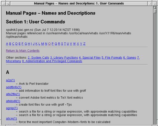 Figure 3 shows part of a name-description index for section 1 of the man pages. The index includes an alphabetic sub-index and links into the other sections of the manual. The name-only index in Figure 4 is similar to the name-description index, except that it is more compact.