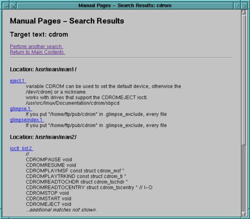 Figure 5 shows the result of a full text search for pages containing a reference to “cdrom”. Links are generated to each page matched.