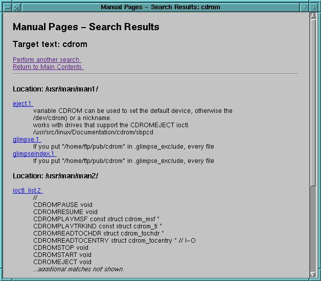 Since the traditional Unix man program doesn't provide for searching the full text of the manual pages, I wanted to add this ability to vh-man2html. Enter Glimpse, a freely available program created by Udi Manber and Burra Gopal, Department of Computer Science, University of Arizona, and Sun Wu, the National Chung-Cheng University, Taiwan. Glimpse is a text file indexing and search system that achieves fast search speeds by using precomputed indices. Indexing is typically scheduled for the wee small hours of the morning, when it won't impact users.