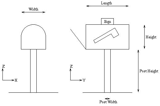 The amount of planning needed to build an image is directly related to its complexity. Complex images should be built in the same manner as a complex program—by first getting a broad outline to work, and then filling in the details. In our case, the mailbox is fairly simple. We define the z direction to be height above the ground, which is at z=0. The post the mailbox rests on will be located at x=0 and y=0 to make things easy. See Figure 1 for a simple plan of the mailbox.