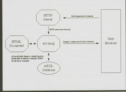 w3-msql acts as an HTML “preprocesser” of sorts. It takes a standard HTML document and performs database actions based on embedded mSQL primitives as shown in Figure 1.