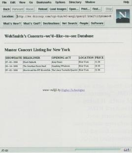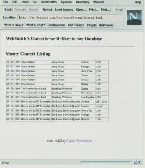 Note the calling procedure. The document name is placed immediately after the invocation to w3-msql (PATH_INFO). w3-msql takes this document, looks for any embedded mSQL commands and sends the appropriate output to the client. In this case, we are requesting the query1.html document, which contains the HTML shown in Listing 5. HTML Document. When selected, the output of the w3-msql link is shown in Figure 2.