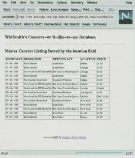 While the previous example is rudimentary, it demonstrates the ease of presenting information from an mSQL database. Let's continue with this example by expanding our queries. One nice feature to implement is the ability to produce a listing sorted by a specific field. Consider the following rewrite of our ex1.html file, which adds several hypertext links, each sorted on a different field. The file, called ex2.html, is shown in Listing 6.