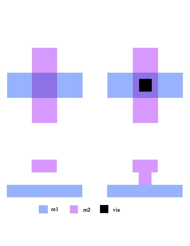 Each step in the fabrication process uses a different mask. Suppose we have a chip with two layers of metal wiring. We'll call the layer closest to the silicon base “m1” and the layer closest to the top “m2”. Because m1 and m2 are different layers, m2 wires can cross over m1 wires without making electrical contact. This is like a high road using an overpass to cross a low road. The left side of Figure 1 illustrates, in both an aerial and cross-sectional view, a vertical m2 wire overlapping a horizontal m1 wire. Note that the two are electrically separate. Suppose now that we want to create a point where a signal can cross from m1 to m2. To build this structure, we need a mask for m1, a mask for m2, and a mask for vias. A via is a hole in the insulating layer, which separates m1 from m2 and allows m2 to flow downward and contact m1, forming an electrical connection. This is shown on the right side of Figure 1; the black square is the via, which connects the two layers. Transistors are more complicated, requiring more masks and different materials.