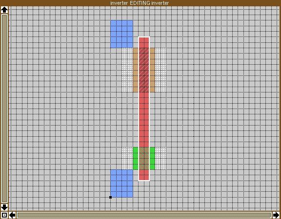 The transistors need poly running over the diffusion. In an inverter, the two polys for the transistors are connected together. This is the inverter's input—the signal driving the inverter is connected to the poly. It's simplest, then, to draw a single piece of poly which crosses both diffusions. Place the box at ll=(5,3) and ur=(7,29) and type: