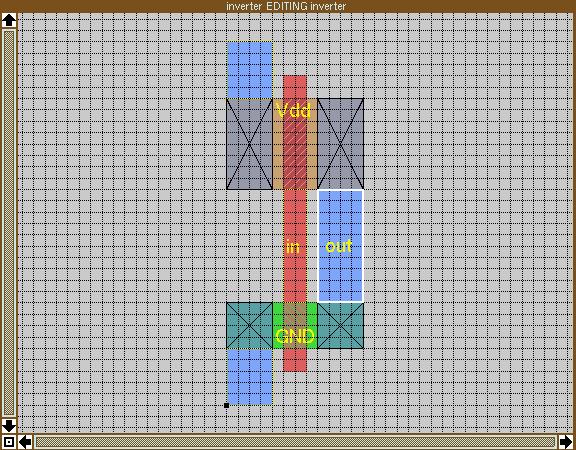 There are a couple of important points to notice. First, the area where the poly crosses the diffusion has a diagonally-striped pattern different from both poly and diffusion. This area represents the actual transistor, since FETs are constructed wherever poly passes over diffusion. To see this, place the cursor over the top transistor, and select it by pressing the s key. Now enter :what, which displays the names of the selected paint. Here, the selected area is “ptransistor”; Magic actually changes the paint from pdiffusion to ptransistor when poly crosses over it. The same concept applies when poly crosses over n-diffusion to form an “ntransistor”.