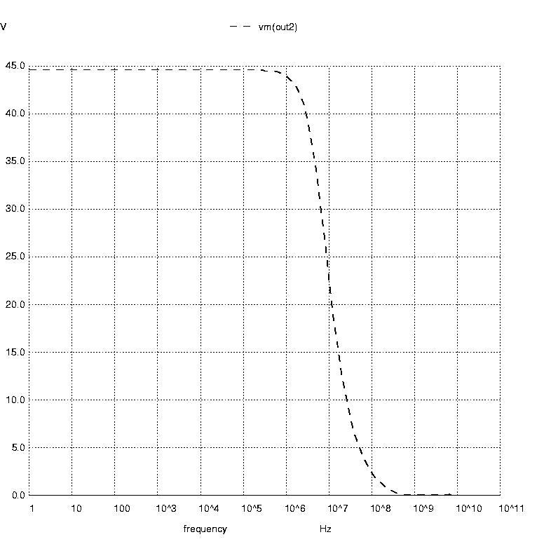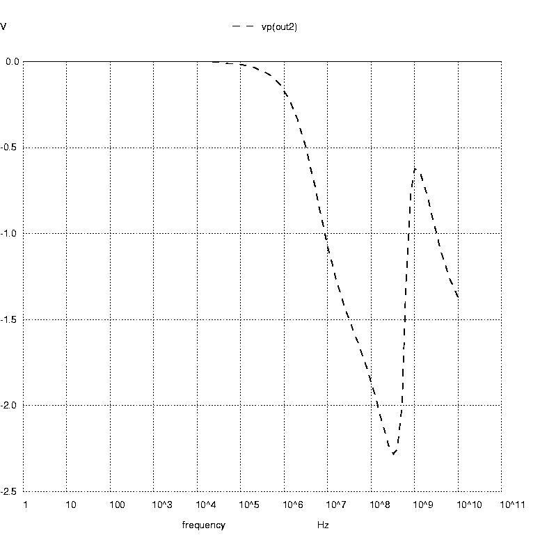 Nutmeg prompts 11 through 16 create the AC analysis plots of voltage phase at node out2 in degrees, voltage phase at node out2 in radians and magnitude of the voltage at node out2. These are shown in Figures 3 through 5, respectively.