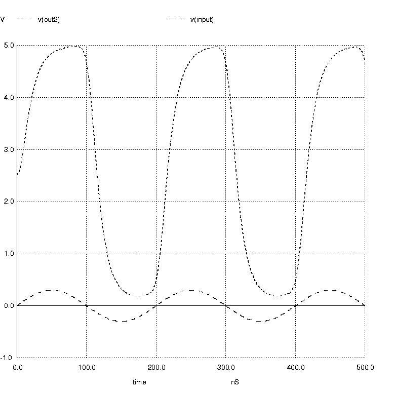 The DC transfer characteristic plot shows output voltage, from left to right, ranging over 0V to 5V and shows the input voltage, from top to bottom, ranging from -0.15V to +0.15V. Each time I view a plot like this I get nostalgic, recalling the days when I would flip switches on the front panel of a PDP-8 and load boot programs from paper tape. But that's another story. This plot certainly isn't fancy by today's standards, but it does convey the necessary information.