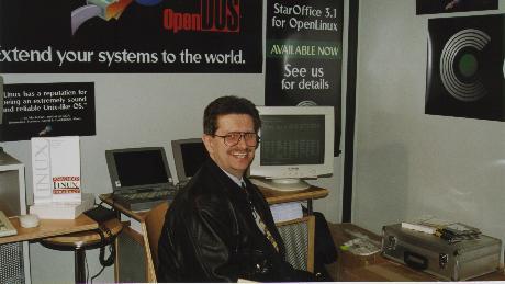 At the the third Linux stop, the large Software AG booth, there was a signpost saying Datenbanktechnologie and the second sign down said “ADABAS & LINUX”. Tux sat proudly on top of the workstation here by the Caldera OpenLinux Base. Nathan Guinn gave me a free review copy of the single-user version of LunetIX's ADABAS, an SQL Database, which I passed along to the Editor of Linux Journal.