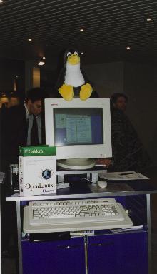 My first stop was Hall 11 to visit Caldera, Inc. Caldera's booth was easily recognizable as a Linux booth because of “Tux” the penguin, (well, a stuffed rendition of Tux) sitting on top of one of the monitors. Caldera's booth was crowded with people every time I visited it.