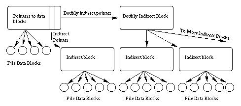 The first thirteen pointers point directly to blocks containing file data. If the file is thirteen or fewer blocks long, then the file's data is pointed to directly by pointers within each inode and can be accessed quickly. The fourteenth pointer is called the indirect pointer and points to a block of pointers, each one of which points to data on the disk. The fifteenth pointer is called the doubly indirect pointer and points at a block containing many pointers to blocks each of which points at data on the disk. The picture shown in Figure 1 should make things clear.