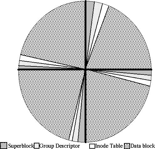 The EXT2 file system is divided into groups, which are sections of a partition. The division into groups is done at the time the file system is formatted and cannot change without reformatting. Each group contains related data. A group is the unit of clustering in the EXT2 file system. Each group contains a superblock, a group descriptor, a block bitmap, an inode bitmap, an inode table and finally data blocks, all in that order.