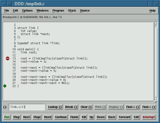 Variable and function visualization is not unfamiliar to gdb users. However, one of the most amazing things in ddd is visualizing pointers; for example, create an integer pointer and have it point to an integer. Create a watch on the pointer. In the content section of the watch, you will see the memory address of the integer pointed at. Click on the content and then click the Dereference() button. At this point a new cell is created, containing the integer variable, with an arrow extending from the pointer to the integer. Taking this concept a little further means that you can graphically visualize complex data structures, structures, arrays and almost anything you wish. For example, Figure 1 displays the source code for a linked list, while Figure 2 displays the ddd visualization of it.
