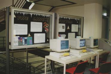 Last summer, Alois Camenzind thought that a small Linux expo would be a good idea. This would enable us to spread information about Linux and its uses—let others know that Linux is a “real” Unix system. After getting the “Okay”, Camenzind contacted employees within the section who had expressed both knowledge and interest in Linux. We formed an unofficial workgroup to prepare the Expo. The main work was producing posters with information about Linux and Linus Torvalds, getting resources (machines), setting up the machines and contacting interested companies for information and products.