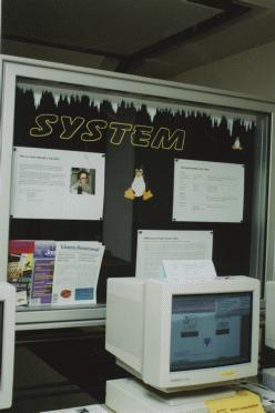 Behind the machines (see photographs) were the panels with posters about Linux (all in German): “What is Linux?”, “Information sources for Linux”, “The GNU General Public License (GPL)”, “Linux Development History”, “Linux Time Line” and “Who is Linus Torvalds”. We also made information provided by SSC and Red Hat available beside the machines.