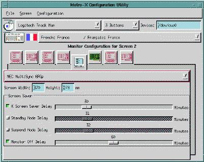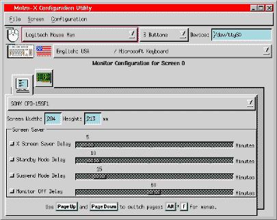 The Monitor button displays a huge list of common monitor types, and automatically creates the allowable frequency range and synchronization. If your monitor isn't on the list, don't worry—there are lots of generic monitor types to choose from. You can even enter the exact screen size and select the screensaver delay time. If you have a energy star monitor, you can set standby, suspend and monitor off.