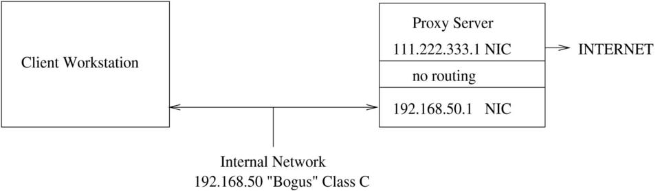 Configure your kernel to keep it from routing IP packets (see Listing 1). To further ensure protection and anonymity, use one of the “bogus” class addresses (see Table 1) as per RFC1918. These IP addresses are set aside by the INTERNIC for use behind a firewall. Any packet with one of these IP addresses is dropped by the Internet backbone routers. See Figure 1 for an example of a network topology with a dual-homed host firewall. The example configuration files in this article are based on this basic topology. Our protected network is assigned the “bogus” Class C address 192.168.50, and we assume that the valid IP address of the Internet side of the firewall is 111.222.333.1.