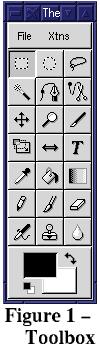 When you start the GIMP, you'll find it provides a single, small window with a set of buttons, called the Toolbox. The Toolbox is the starting point for creating images and is made up of a menu bar, the tool buttons and the foreground/background color block. If you are familiar with Adobe Photoshop then the look and feel of the Toolbox should be quite familiar to you. Figure 1 shows the default Toolbox configuration.