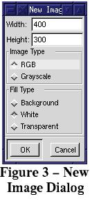 The New option opens a dialog that allows the user to select the dimensions of a new Image Window. The image type (RGB or grayscale) and the type of background to use are also selectable. Figure 3 shows the New Image dialog box. As with many options in the GIMP, you can also open a new window using keyboard accelerators. For a new Image Window, place the cursor over any GIMP window and type ctrl-N.