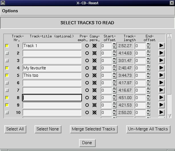 When you wish to copy an audio CD (a music CD) or a mixed-mode CD (a CD that contains one data track and some music tracks), you must copy each track to a single file. X-CD-Roast is equipped with a built-in player so you can listen to each track via a sound card. You can read audio tracks in any sequence and from as many CDs as you wish, as long you keep in mind that only about 74 minutes (or 63 minutes) fit on one CD-Recordable.