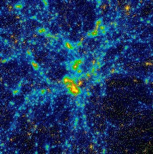 Figure 4. Intermediate stage of a gravitation N-body simulation of galaxy formation using 9.75 million particles. It took about three days to compute on Loki at a sustained rate of about 1GFLOP.