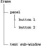 Note that a hierarchy (see Figure 1) is forming. The frame is a parent of the panel and the text sub-window. The panel is a parent of the two buttons. When we resize the frame, its child components resize with it. The user interface could become quite sophisticated (i.e., complex) but still remain manageable, because of the relations that form among the frames, panels and other components. Our callback routines are invoked by other routines deep within XView and are passed the component and the event that produced this call (in this simple case, the button and the mouse-button-up event).