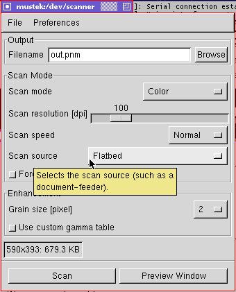 The PNM pseudo-device may be fun, but what does a real scanner interface look like? Figure 3 shows the xscanimage dialog as it appears for Mustek flatbed scanners. The figure also demonstrates another feature of xscanimage: tool tips (also known as “balloon help”). Tool tips make it easier for new users to get acquainted with the capabilities of their scanner or camera. In the figure, the mouse points to the Scan<\!s>Source menu and, as a result, the help information for that menu is shown in the yellow box below the mouse pointer. Tool tips are handy for new users, but after a while, they tend to get in your way. Thus, xscanimage allows advanced users to turn off the tool tips using the Preferences sub-menu.