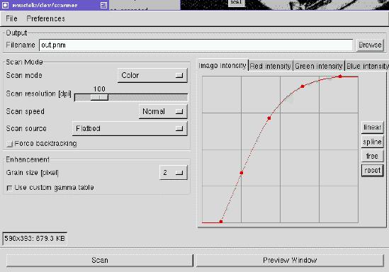 As you can see, the Mustek dialog looks quite different from the PNM pseudo-device interface. This is because the underlying devices have different capabilities. In fact, the device dialog depends not only on the selected device, but also on the mode of the device. For example, when turning on the “Use custom gamma table” option near the bottom of the dialog, the interface changes, and the result is shown in Figure 4. As you can see, the right half of the dialog now contains a graph editor that allows the user to modify the intensity, red, green or blue gamma table. In other words, xscanimage displays precisely the options that are active or meaningful for a given scan mode, greatly reducing the likelihood of confusing the user.