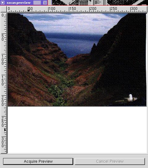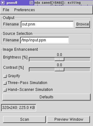 You may say: cool, but where is the graphical user interface? Assuming you had the GTK libraries installed when SANE was built, you can invoke a program called xscanimage that will present you with a dialog box containing a list of available devices. If you double-click on the “pnm:0” entry, you'll get the dialog shown in Figure 1. As you can see, the dialog includes two text-entry boxes labeled “Filename” and a slider labelled “Brightness”. If you enter “out.pnm” in the first text-entry box and “input.ppm” in the second box and move the brightness slider to 50.0, you can press the Scan button at the bottom left and get the same result as with the scanimage command line shown above. Of course, before doing the actual scanning, you could press the Preview button at the bottom right to pop up a preview window (see Figure 2). In the preview window, you can push the Acquire<\!s>Preview button to obtain a low-resolution preview of the final image. For example, by moving the brightness slider around, you can see how the brightness of the image is affected. After moving the slider, you'll need to press the Acquire Preview button to get an updated preview.