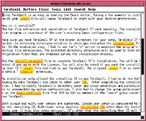 TeraSpell 97 for Emacs is a shareware version of the Teragram Corporation's Teragram Spell 97 for Windows, Mac and Unix. Naturally there are some differences between the shareware and the full product. TeraSpell for Emacs provides the Emacs user with a flexible multi-language tool for spell checking documents. As a test, I decided to use TeraSpell 97 and Emacs to write this review.