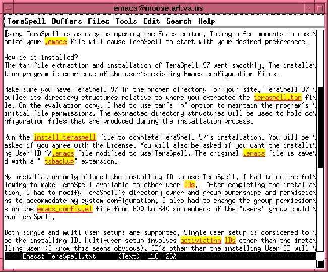 TeraSpell came as a gzipped tar file. The tar file extraction and installation of TeraSpell 97 went smoothly. The installation program was courteous of my existing Emacs configuration file.