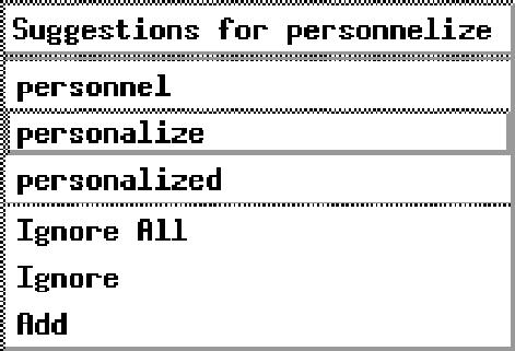 Using TeraSpell is as easy as opening the Emacs editor. TeraSpell appears as the left-most item on the Emacs menu. TeraSpell menu options include spell checking a region, buffer or word and spell checking words on the fly. You may also alter several default settings. Preferences that may be adjusted include the default dictionary, the foreground and background color used to highlight misspelled words, the underlining of misspelled words and the placement of the suggested spelling's floating menu.