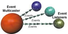 When you create event classes, make sure they contain appropriate information and are generated in response to appropriate user actions. It can get confusing when you start to generate your own events. First, you create the event classes. Next, you create a listener interface. This interface defines methods of the listeners that will be called when an event occurs. Finally, you create an event multicaster. Event multicasters have the job of broadcasting events to many listeners. Sounds complicated, but hopefully it will become clear after an example or two. Figure 2 is a diagram of the multicasting process.