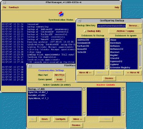 PilotManager is a Perl/Tk graphical interface to the Pilot. It apparently works with CDE's Calendar applications, but since I don't run CDE I didn't try this feature out. The list of features states the PilotManager has four primary features: uploading new applications and databases, synchronizing the Pilot with the CDE Calendar application, uploading text files as Pilot Memos, and backing up the Pilot to your UNIX system.