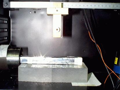 Figure 2. The dark chamber of our experimental bench: crystals to be measured are inserted here. The rail on the top moves a small radioactive source along the crystal (here wrapped in aluminum foil) and the produced light is collected by the phototube on the left.