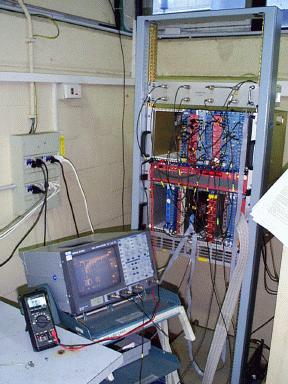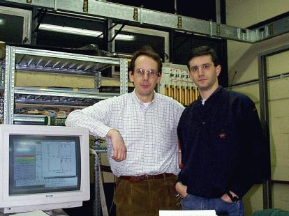 Figure 5. The authors of this article in their natural environment. On the left, with an arm on the DAQ PC, is Emanuele Leonardi and on the right is Giovanni Organtini.