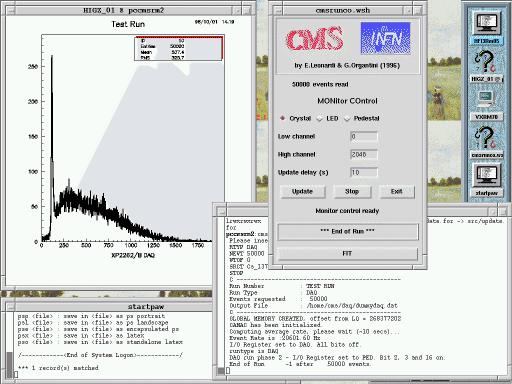Figure 4. This is a snapshot of our PC screen during an actual DAQ run. In the center you can see the Tcl/Tk-based control interface while the window on the left shows the data collected during the run. The histogram, updated in real-time during the run, is created using the HBOOK and HPLOT packages of the CERN libraries.
