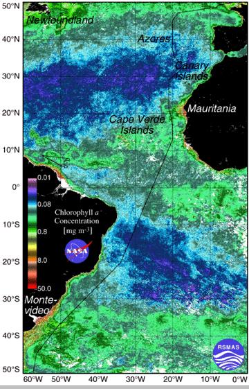 Figure 2 shows the track taken by the James Clark Ross during the and AMT-5 cruise superimposed on a monthly composite satellite image of Chlorophyll a derived from the Sea-viewing Wide Field-of-view Sensor (SeaWiFS) carried on the SeaStar spacecraft. Different types of phytoplankton have characteristically different concentrations of chlorophyll and are, therefore, different in color. By measuring the color of the ocean with the SeaWiFS instrument, estimates of the amount and general type of phytoplankton in specific regions can be made as shown in Figure 2. An extensive web site provides a wealth of information on the SeaWiFS mission at http://seawifs.gsfc.nasa.gov/SEAWIFS.html.