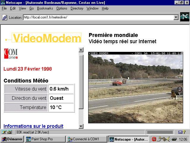 The second port is reserved for ViewCOM administration, such as setting brightness or contrast. Additionally, the daemon can control a weather station in order to get real-time information about external temperature, wind speed and other weather information. A VISCA (a standard for video camera remote control) functionality is about to be added to control zoom, pan-and-tilt and other camera parameters directly from the Internet browser. Figure 4 is a snapshot of the Bordeaux/Bayonne motorway on the private COM1 web server.