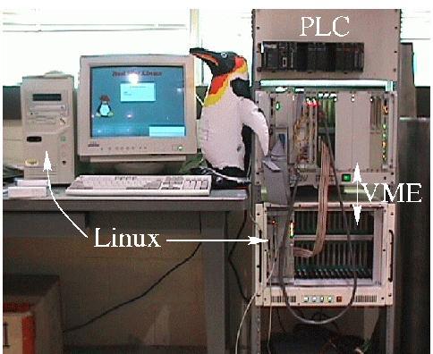 Figure 2. One of our experimental stations, with the instrument control computer on the left, and two VME crates plus a PLC unit. Linux runs on the PC and in the controller of the lower VME crate.