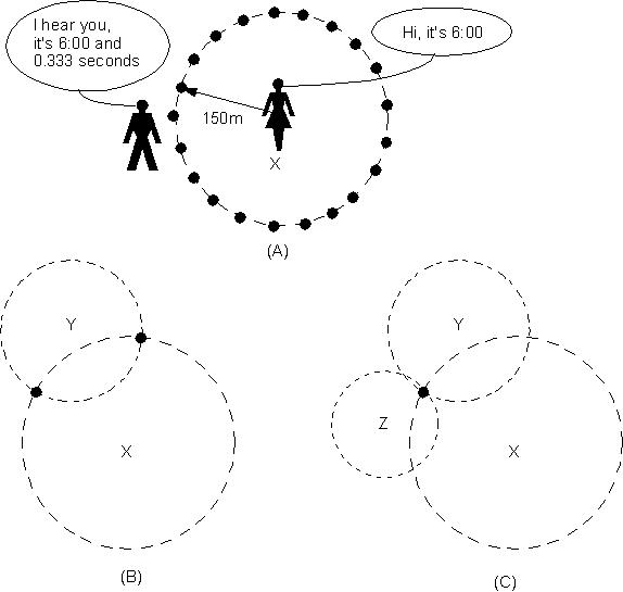 For example, assume you and your friend both have accurate synchronized clocks. At some unknown distance from you, she yells, “It is now 6:00 and 0.000 seconds.” When you hear her, your clock shows the time as 6:00 and 0.333 seconds. You can now compute your distance from her as 100 meters by multiplying the speed of sound (300 meters per second) by the elapsed time (0.333 seconds). With this single test point, you are able to compute your distance from the source. Specifically, you are located in any direction 100 meters from your friend. This scenario is shown in Figure 4A by the multiple dots located on the circumference of the circle.