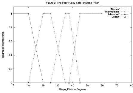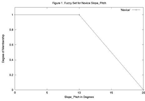 There is no widely accepted ski industry standard for these terms, but there is an approximate agreement on what they imply. For example, most skiers would consider the pitch range of 0 to 10 degrees as Novice, but there would be less agreement on the angle at which the slope would be considered no longer Novice, but Intermediate. Fuzzy Logic would accommodate this uncertainty by defining a fuzzy set for novice slope pitch as shown in Figure 1, where the vertical axis is called the degree of membership (dom). In Figure 2, the fuzzy sets for Intermediate, Advanced and Expert are incorporated as well. Looking at Figure 2, an input Slope_Pitch of 17.5 degrees would have a degree of membership of 0.25 in the Novice category and of 0.75 in the Intermediate category, reflecting the fuzzy transition from Novice to Intermediate Slope_Pitch. Ascertaining the doms of the various input values is called the fuzzification process.
