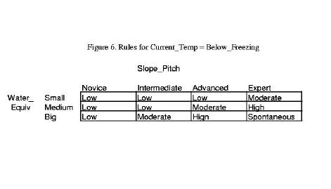 Hence the related rule is, “If Water_Equiv is Small AND Slope_Pitch is Novice AND Current_Temp is Below_Freezing, then Avalanche_Danger is Low”; the same rule quoted earlier.