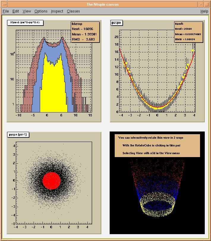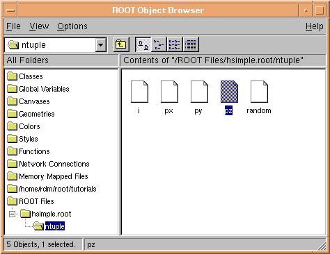 will fill a histogram containing the distribution of the px values for all tuples for which pz < 1. Substitute for the abstract quantities used in this example quantities such as name, sex, age, length, etc., and you can easily understand that Ntuples can be used in many different ways. An Ntuple of 25,000 tuples is quite small. In typical physics analysis situations, Ntuples can contain many millions of tuples. Besides the simple Ntuple, the ROOT system also provides a Tree. A Tree is an Ntuple generalized to complete objects. That is, instead of sets of tuples, a Tree can store sets of objects. The object attributes can be analyzed in the same way as the tuple quantities. For more information on Trees, see the ROOT HOWTOs at http://root.cern.ch/root/Howto.html.